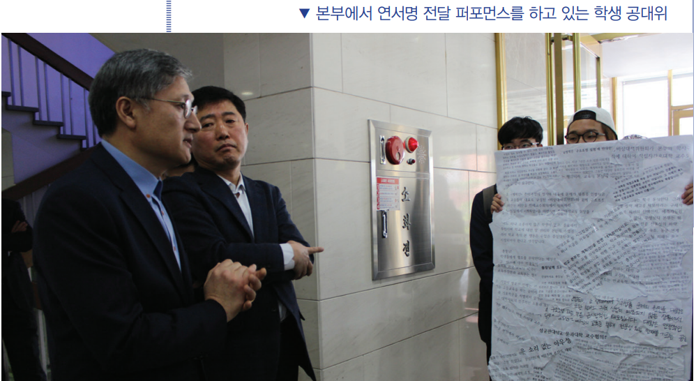 공대위는 이후 총장에게 연서명을 전달하기 위해 본관으로 이동했으나 이는 본부의 접수거부로 타결되지 않았다. 본부 관계자는 '총장님은 외부 일정 중'이라며 '총학생회를 통해서만 받겠다'는 입장을 보였다. 공대위는 공식적인 대표자가 아니기 때문에 연서명을 전달할 수 없다는 설명이었다.