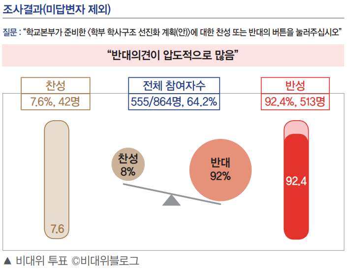 우선 비대위는 3월 9일부터 11일까지 3일 동안 교수 전체투표를 진행했다. 이 투표는 개편안 자체에 대한 찬반을 안건으로 진행됐다. 26일에 진행되었던 개편안을 유보하고 공식적 논의절차를 거칠 것을 요구한 투표와 달랐다. 여전히 기본 틀에 대해 구성원들과 ‘논의’가 아닌 ‘설명’을 하고자 하는 본부에게 확실한 교수들의 의견을 전달하기 위함이었다.