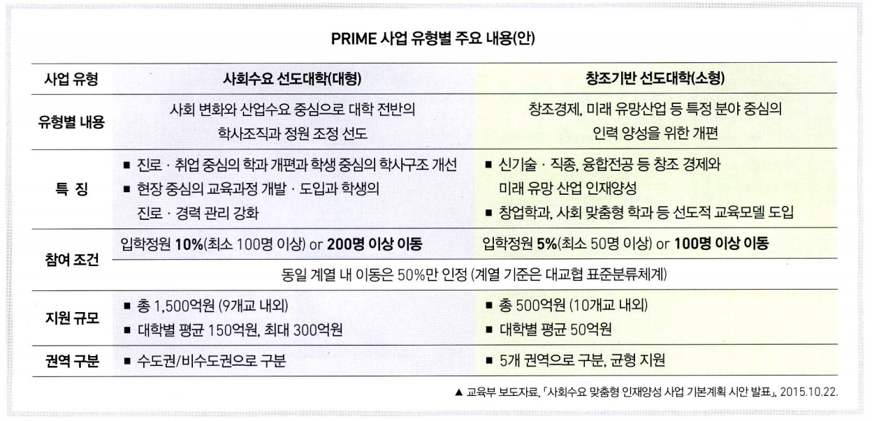 광역모집 입학생을 단과대학에서 관리하기로 한 이후로 대표자 회의의 주된 안건은 프라임 사업(PRIME: PRogram for Industrial needs — Matched Education)이 었다. 프라임 사업은 ‘산업연계 교육활성화 선도대학’ 사업으로, ‘사회변화와 산업수요에 맞도록 대학의 체질개선’을 이끌어내 ‘인력의 미스매치 해소’를 목적으로 하는 교육부 주관 재정지원사업이다. 중장기적인 인력수급을 예측했을 때 이공계열의 인력은 수요보다 부족한 반면, 인문사회·예술계열의 인력은 수요보다 많이 배출되기에 이를 조정하겠다는 이야기다. 올해 프라임 사업에 배정된 예산은 약 2000억 원으로. 앞으로 총 3년 동안 사업이 지속될 예정이다. 사업 유형은 1500억 원 규모의 사회수요 선도대학(대형)과 500억 원 규모의 창조기반 선도대학(소형)으로 나뉜다.