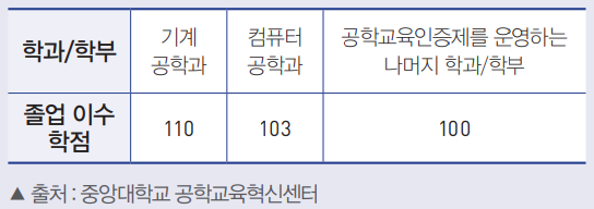 공학교육인증제는 한국공학교육인증원(Accreditation Board for Engineering Education of Korea)으로 부터 인증을 받은 공학 프로그램을 이수한 학생들이 실제 현장에서 성공적으로 투입 될 수 있는 준비가 되었음을 보증해 주는 제도다. 현재 중앙대학교에서는 ▲토목공학 ▲건축공학 ▲화학공학 ▲기계공학 ▲전기전자공학 ▲컴퓨터공학전문 프로그램을 운영하고 있다. 현재 인증프로그램을 수료하기 위해서는 1학년 1학기부터 4학년 2학기까지 정해진 커리큘럼을 따라 가야하는 구조다. 커리큘럼에 따른 이수학점은 다음과 같다.