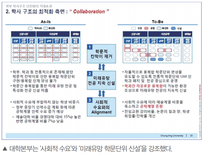 대학본부는 모집단위 광역화의 배경 중의 하나로 학문 간의 ‘융·복합’을 제시했다. 이를 통해 ‘사회적 수요’에 부합하는 ‘미래유망 학문단위’를 설치하는 것이 최종 목표다. 그런데 이 말이 나온 맥락이 조금 심상찮다.