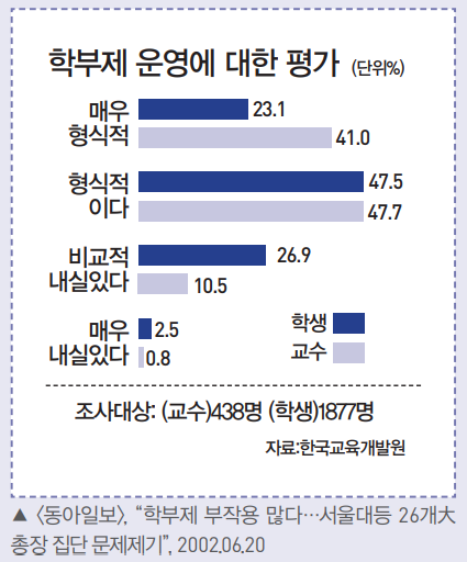 한편 학부제를 실시했던 배경은 ‘학생들의 적성을 고려한 전공 선택권 확대’였다. 사회가 필요로 하는 창의적이고 폭넓은 지식을 지닌 인재를 양성하기 위해 복수 전공 및 다중 전공을 유도한다는 목적도 있었다.