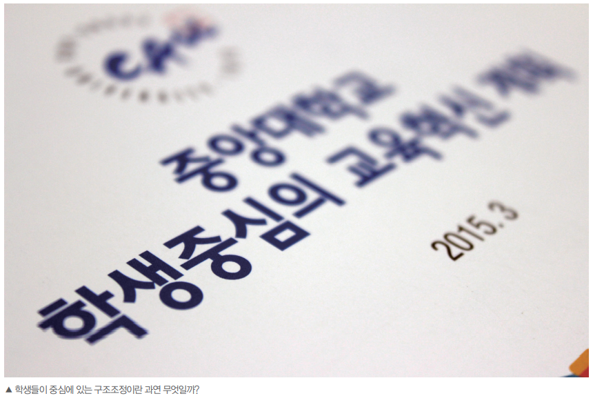 <제 3차 중앙대학교 학사구조개편 대표자 회의> 회의록 참고: 중앙대는 고등교육법 제 34조의5(대학입학 전형계획의 공표)에 따라 <입시 3년 예고제>를 시행하고 있다. 이로 인해 2016-2017학년도의 입시전형에 관한 사항은 이미 공지돼 학문 단위를 바꾸는 것은 가능하지만, 전형요소와 비율을 바꾸는 것은 불가능하다. 중앙대가 3년 전 제출한 입시 전형에 따르면 정시가 22%, 논술이 25%, 학생부종합이 35%, 고른기회전형이 3% 등이다. [본문으로]