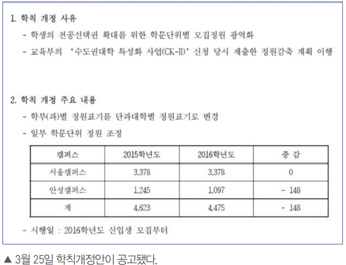 하지만 바로 다음날 발표된 학칙 개정안은 ▲일부 학문 단위 정원 조정(안성캠퍼스 정원 148명 감축)과 함께 ▲학부(과)별 정원표기를 단과대학별 정원표기로 변경한다는 내용만 공고하고 있었다. 협의체에서 논의하겠다는 세부 사항은 온 데 간 데 없었다. 신입생을 대상으로 하는 커리큘럼, 신입생 지도 및 관리, 부작용에 대한 대책 등이 전무했다.