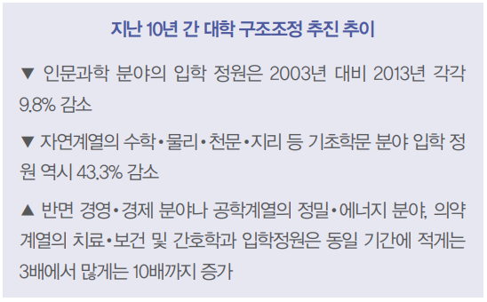 여기에 고용노동부의 <2013~2023 중장기 인력수급전망 통계>는 구체적인 근거가 됐다. 2014년 대학 입학 정원과 비교할 때 앞으로 자연계열은 5.5% 인력이 남고, 공학계열은 5.4% 모자란다고 한다. 인문계 비중(2012년 추정 8.9%)도 정원 대비 4.2% 인력이 남게 된다는 것이다.