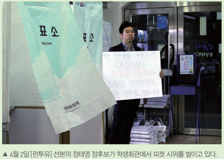재투표가 실시되자 [런투유] 선본은 다시 피켓을 들었다. 4월 2일 정태영 정후보는 ‘지난 투표에서 선거인 명부의 조작이 의심스럽고 이번 재투표의 선거인 명부도 믿을 수 없다’며 투표소 옆에서 1인 시위를 벌였다. 선관위는 ‘재투표 선거인 명부에는 오류가 없다’며 문제제기를 일축했다.