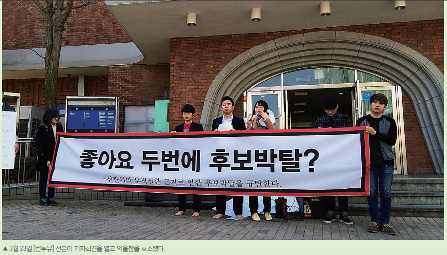 하지만 불행은 다시 찾아왔다. 한 선본이 페이스북 ‘좋아요’ 때문에 후보 자격을 박탈당한 것이다. 평화롭던 빨간 벽돌은 이내 각축장이 됐다. 탈락한 선본은 피켓을 들었다. 선본의 대표는 맨발로 나와 마이크를 잡았다. 선관위도 이에 질세라 대자보를 붙이고 기자회견을 열었다.