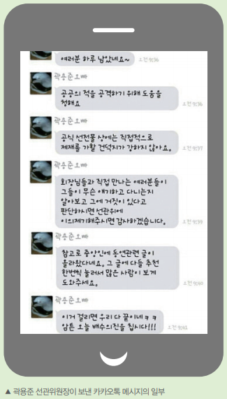 순항하던 선거는 투표를 하루 앞두고 먹구름을 만났다. 11월 24일 아침, 곽용준 선관위원장이 [골드카드]와 [To:Gather] 선본의 정·부후보를 카톡방에 은밀하게 초대했다. 그는 ‘공공의 적을 공격하기 위해 도움을 청해요’라는 노골적인 메시지를 던지며 [무한동력] 선본에 대한 비방을 요청했다. 그러나 선관위 원장의 부정은 곧 덜미가 잡혔다. [To:Gather] 선본의 당선으로 선거가 끝난 26일, [골드카드] 선본이 회식 자리에서 [무한동력] 선본을 우연히 만났다. [골드카드] 선본은 [무한동력] 선본에 카톡방의 정체를 폭로했다.