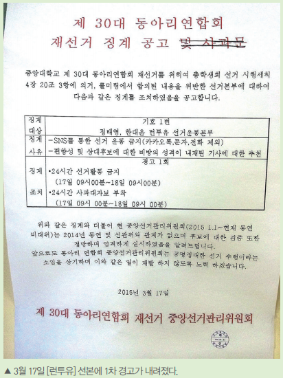 7. <중대신문>, “동연 재선거, 런투유-선관위 입장 갈등 공방전”, 2015.03.29. [본문으로]