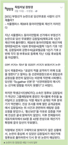 1. <잠망경>, “부정선거 논란으로 당선무효된 사람이 선거 재출마?-서울캠퍼스 제 30대 동아리연합회 재선거 치러진다”, 2015.03.15. [본문으로]