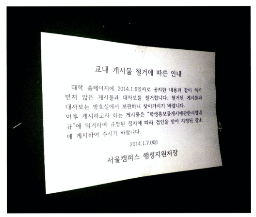 [2] 학내온라인커뮤니티<중앙인>, 「교내 대자보 철거에 따른 사전 안내문」, 2014.1.6