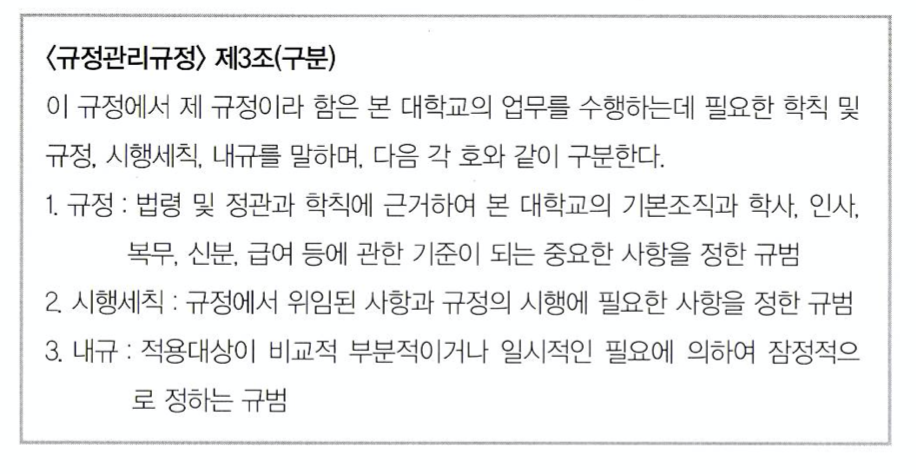 <고등교육법〉제6조에서는 법령의 범위에서 학교규칙(이하 학칙)을 제정하도록 명시하고 있다. 학칙은 학사 일반과 운영에 관한 내용을 명문화한 규칙이다. 그러나 학칙에 모든 행정 지침을 담을 순 없다 만일 모든 행정의 기준과 절차를 학칙에 명시한다면, 그 분량은 수백 쪽에 달할 것이다. 학칙은 총칙과 학사 행정의 기본적인 원칙 정도만 나타낸다. 그 외에 구체적인 사항은 '제(諸) 규정’이라는 규범을 통해 정한다. 제 규정에는 ‘규정’, 지행세칙’, ‘내규’가 있다. 각자 역할은 다음과 같다.