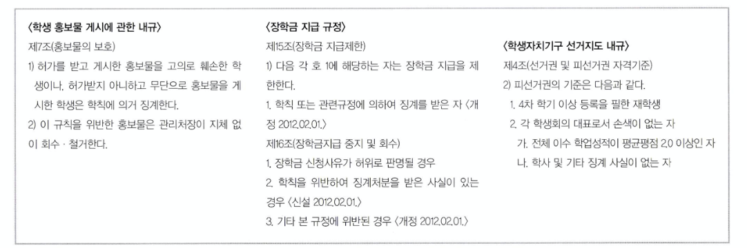 위의 구분과 같이 제 규정은 학칙의 내용을 구체화해 업무 수행을 돕는다. 그러나 단순히 학칙을 보완하는 역할만 수행하고 있을까?