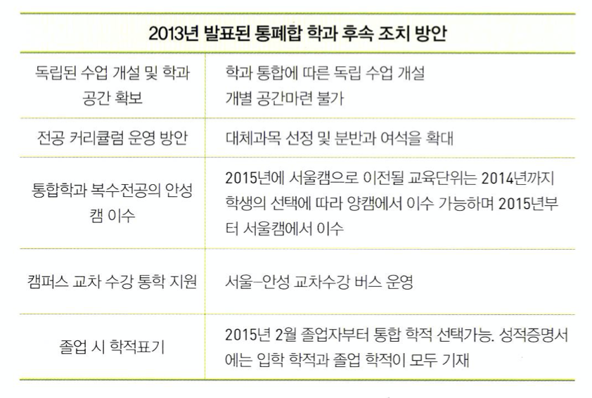안성의 학과에 학적에 대한 이중 약속을 했던 것이다. 한동안 서울캠퍼스 학과 학생회에서는 통합학위 무효 운동을 진행하는 등 학생 간의 골이 깊어지기도했었다.