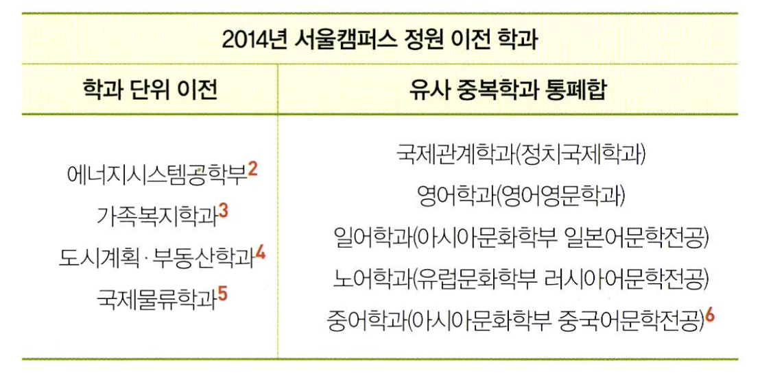 [6] 노어학과와 중어학과의 경우 표면적으로는 학문단위 통합이지만 2011년도에 서울캠퍼스에 해당 전공을 신설하여, 사실상 캠퍼스 이전에 가깝다고 볼 수있다.
