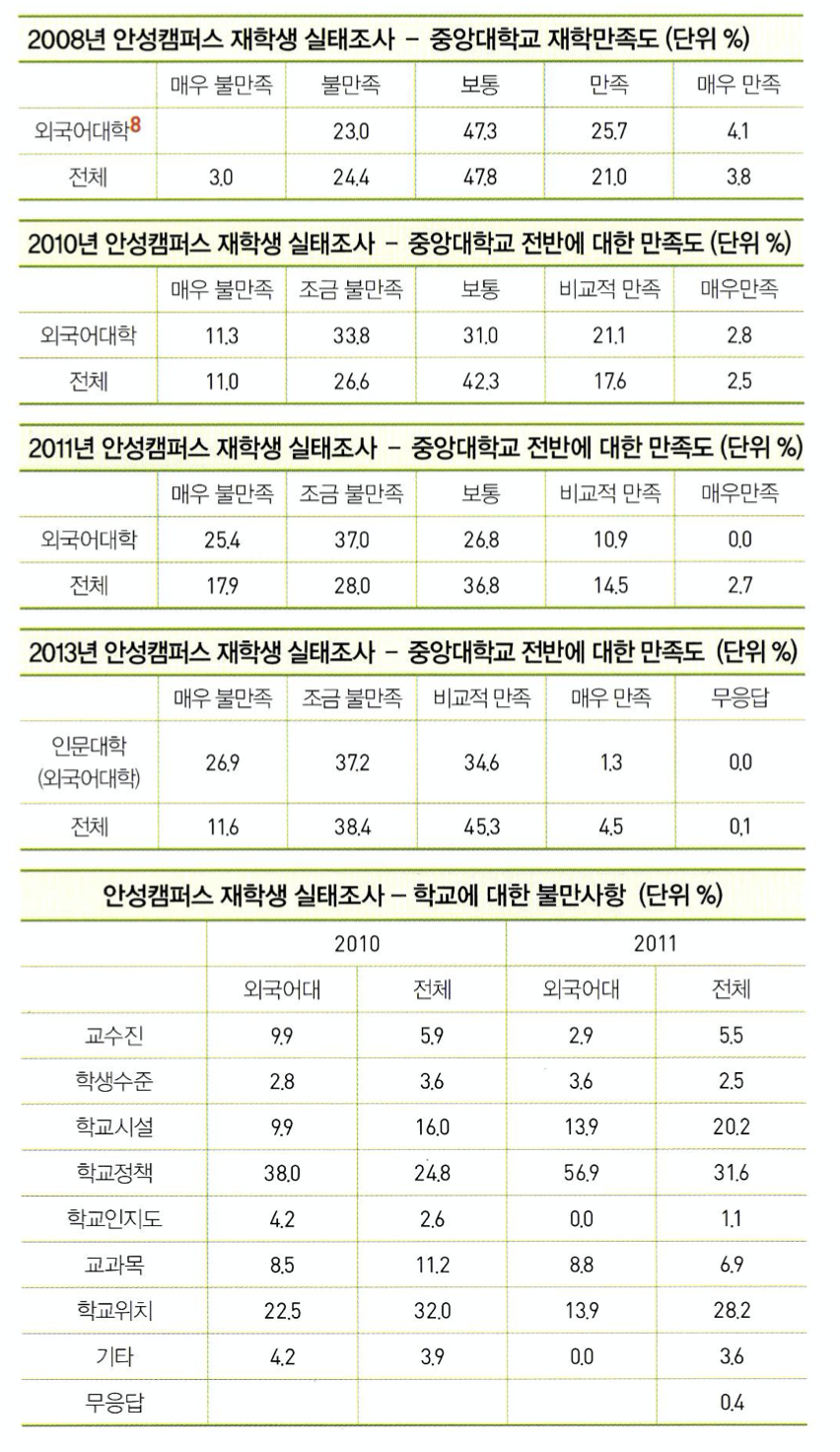 중앙대학교 학생생활상담소에서 발간하는 재학생조사연구보고서를 살펴보면, 안성캠퍼스 재학생의 학교 전반에 대한 만족도를 알 수 있다. 설문지의 항목이완전히 같지는 않기에 1:1로 대입하기에는 어려움이 있지만, 재학생들의 불만이 늘어났음을 쉽게 찾아볼 수 있다.