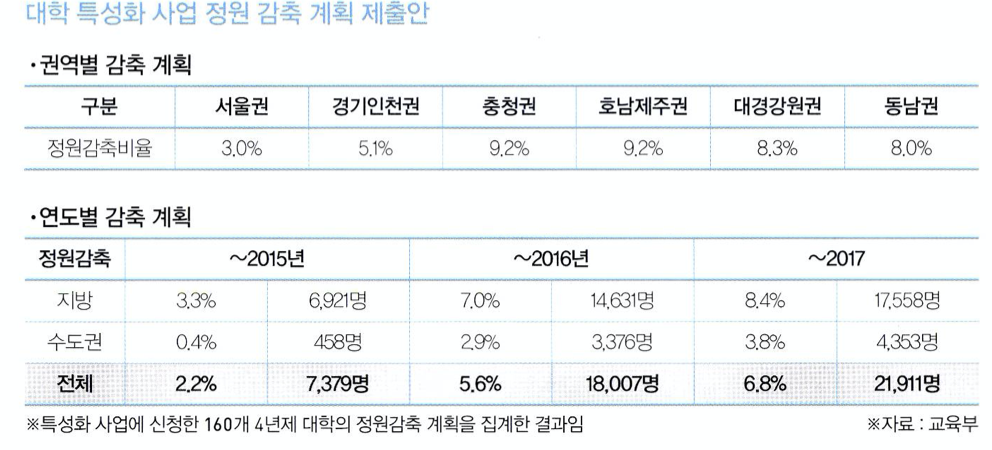 교육부는 지난 1 '대학 구조개혁 추진 계획’을 발표했다. 대학 입학자원이 급감함에 따라 정부주도의 정원 감축이 불가피하다는 것이다. 정부 구조개혁 계획은 크게 강제 감축 '자율 감축’으로 나누어진다. 구조개혁 계획 자체는 강제 감축의 형태이지만 정부가 구조개혁 계획을 대학 재정지원사업[1], ‘정부재정지원제한대학’ 평가[2] 연계한다고 발표함에 따라 현재의 자율 감축 사태가 벌어졌다.