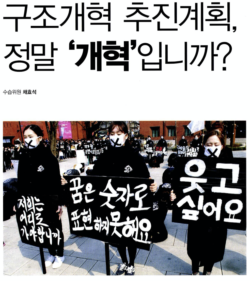 다른 문제는 방치한  단순히 학령인구  대학입학정원만 맞추겠다는 피상적인 정원감축안’이 되어선  된다. 그것이 '구조 개혁’은 아니다. 본질적인 구조를 개혁하기 위한 정책의 재검토가 필요하다.