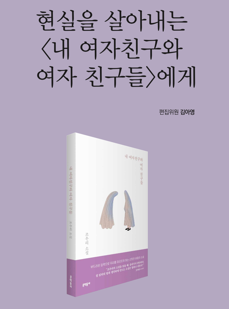 조우리 작가는 작가의 말에서 소설 속의 여성들에게 감사의 인사를 전했습니다. 그리고 인터뷰에선 이런 말도 했죠. ‘소설이 마침표를 찍었어도 그게 끝이라고 생각하지 않’는다고요. 소설이 끝나도 그들의 삶이, 혹은 그와 비슷한 하루를 살아내고 있는 현실의 ‘우리’들이 존재하니까요. 그들의 삶을 둘러싼 불합리한존재들을 새삼스럽게 비추고, 절망 속에서도 끝내 낙관하는 혹은 자신의 힘으로 한 발짝 더 나아갈 수 있는 세상을 그리는 것. 〈내 여자친구와 여자 친구들〉에서 조우리 작가가 주고자 했던 작은 다정이 아닐까요.