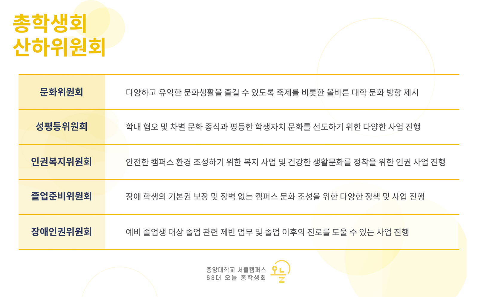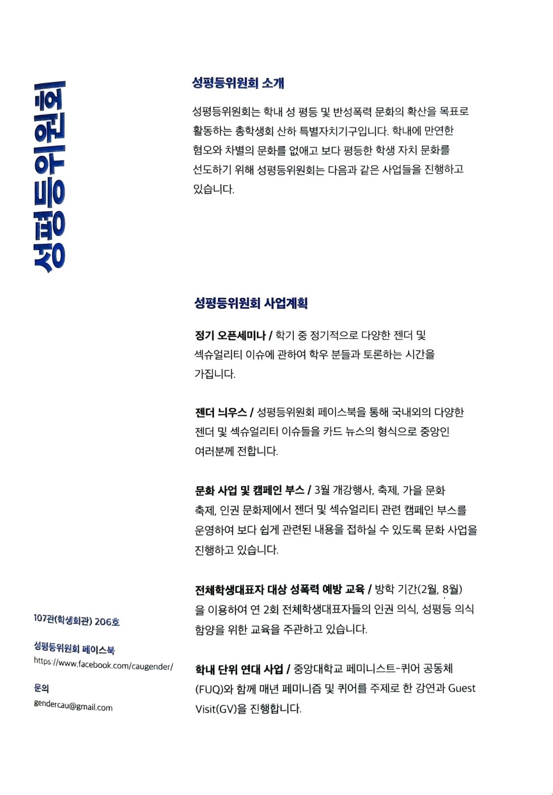〈오늘〉의 1분기 간담회 이후 개정된 '중대중심'5 조직도 역시, 인권과 성평위에 대한 이해가 부족한 대표자들에 의해 수정되었다. 현재 중대중심에 게시된 총학생회 조직도는 '학내 혐오 및 차별 문화 종식과 평등한 학생자치 문화를 선도하기 위한 다양한 사업 진행'이라는 문구로 성평위를 설명하고 있다. 종전의 학내 성평등 및 반성폭력 문화의 확산을 목표로 활동에서 '성평등', '반성폭력'과 같은 젠더 관련 키워드가 빠진 것이다. 게다가 이전부터 조직도상 '특별자치기구'로 명시되어 있었음에도 올해 총학은 성평위를 '산하 위원회'로 개칭했다.