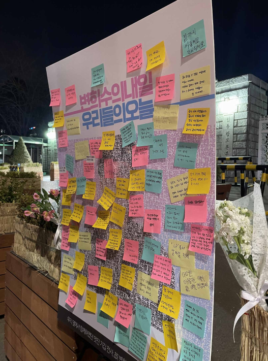 그날은 비가 내렸다. 빗속에서, 우리는 우리를 드러냈다. 비를 막는 하얀색, 분홍색, 하늘색의 우산으로. 광장에 모인 우린 우산을 맞대고 비를 막았고, 우리의 외침이 빗소리에 묻히지 않게 목에 힘을 주었다. 그럼에도 가슴에 물이 차는 것처럼 먹먹해지는 것은 어쩔 수 없었다. 그렇게 도시의 중심을 채워나갔다.