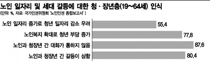 은퇴한 노년층의 재취업과 청년들의 취업 사이에서도 갈등이 존재한다. 취업이 상대적으로 쉬운 임시·일용직 일자리를 두고 노년층과 청년층이 경쟁하는 것이다.9 실업률을 낮추기 위해 정부가 내놓은 공공일자리도 마찬가지다. 박철 KB국민은행 인재개발부 본부장은 ‘60대 이상 취업자 수는 2007년에서 2018년 사이 10년간 60%나 증가했고, 같은 기간 20대 취업자 수는 406만 명에서 366만 명으로 훌쩍 줄었다‘며 20대의 일자리를 60대이상이 잠식하는 모양새라고 말했다.10