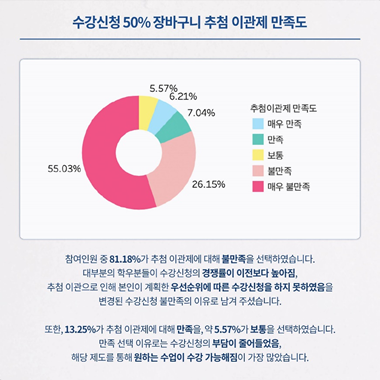 사실 학교 입장에서는 억울할 수 있다. 작년 10월 실시한 수강신청방식 설문조사에서 약 3500명이 추첨 이관제 도입에 찬성했기 때문이다. 찬성자 중 대부분이 50% 이상의 이관비율을 희망했으며 그 중 절반가량은 100%의 이관 비율을 희망하기도 했다.[1] 사전조사에서는 여론이 나쁘지 않았고 고질적인 서버 민원도 줄일 수 있으니 제도 도입이 큰 문제가 되지 않을 것이라고 판단했을 것이다.