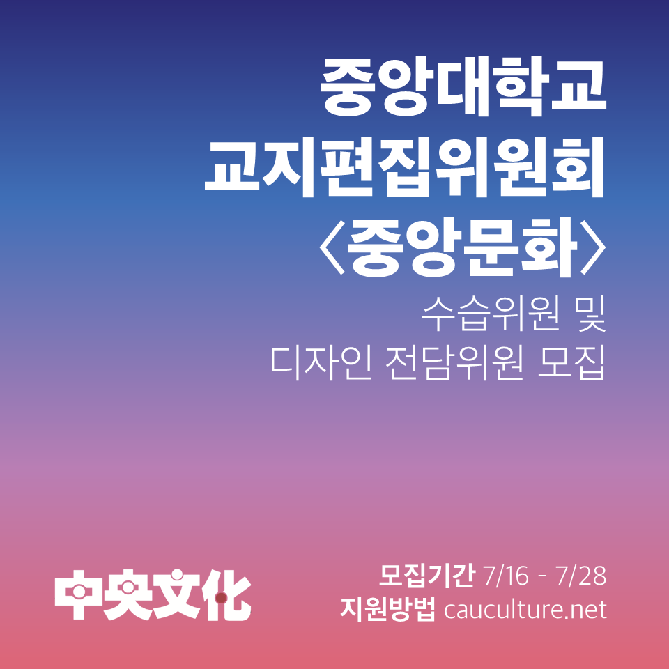 중앙대학교 교지편집위원회 <중앙문화>에서 수습위원 및 디자인 전담위원을 모집합니다. (7/16~7/28)
