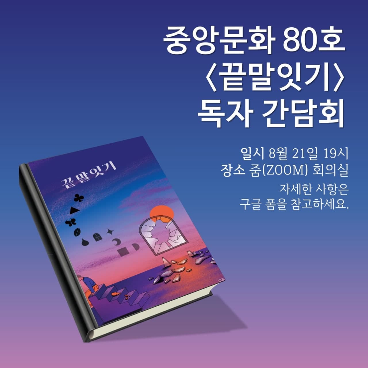 중앙문화 80호 〈끝말잇기〉의 발간을 맞아 비대면 독자간담회를 개최합니다. 80호의 제목인 끝말잇기처럼 간담회를 통해 독자 분들과 많은 이야기를 이어가고자 합니다. 간담회에서는 독자 분들과 80호에 대한 이야기를 나누고 몇 가지 이벤트도 열릴 예정입니다. 추첨을 통해 참석자 분들께 드릴 깜짝 선물도 존재하니, 많은 관심 부탁드립니다.😊