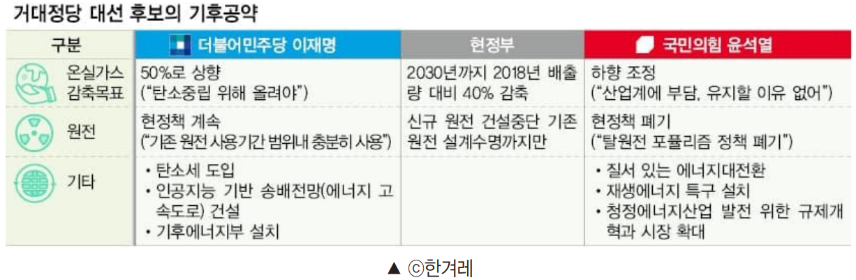 위 표에서 확인할 수 있듯이 양당 후보 모두 기후위기를 인지하고는 있으나, 제시하는 해결법은 상이하다. 현 정부안보다도 앞서간 공약이 있는가 하면, 아직 성장주의8)적 색채를 벗지 못했거나 추상적 구상에 그친 공약도 여럿 보인다. 얼핏 봐서는 이 후보의 공약이 윤 후보보다 진취적이라 평가할 수 있으나, 그만큼 산업구조 전환과 노동의 구조조정을 어떻게 연착륙시킬 것인지 치열하게 고민해 국민 앞에 낱낱이 제시해야 한다.9) 또한 문재인 정부 초창기 신고리 원전 공론화 이후로 큰 진전이 없던 탈원전·에너지 전환 담론을 부활 시켜 토론에 부쳐야 할 것이다. 윤석열 후보도, 제3지대 후보들도 마찬가지다.