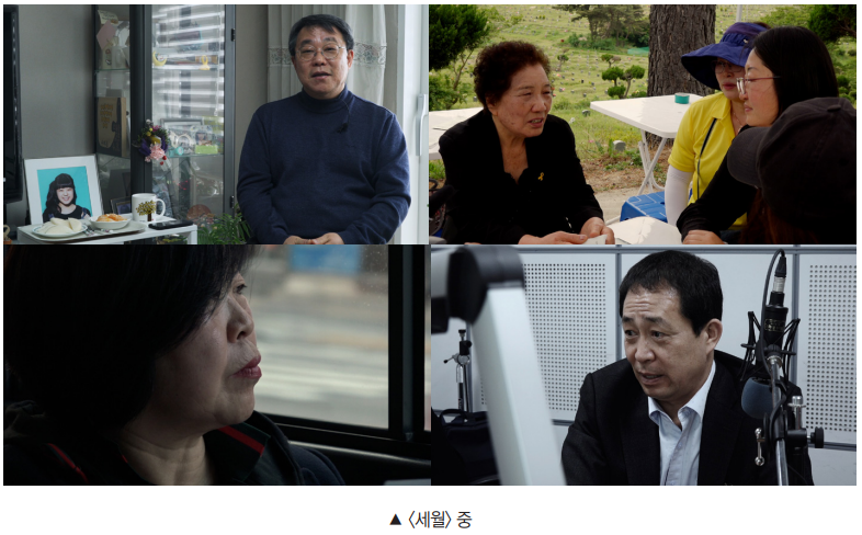 다만 영화를 만들게 된 이유가 위와 같은 당위만으로 이뤄진 건 아니었다. 어쩌면 그보다 이미 내 마음 기저에 새겨진 어떤 이미지들이 나를 움직이고 있었는지도 모른다. 팟캐스트 촬영 당시, 참사 후유증으로 녹음을 잠시 중단해야 했던 황명애가 촬영자인 내게 안부를 묻던 순간, 시차를 두고 유가족이 된 고석과 유경근이 서로에게 미안함을 표하고 위로하던 순간, ‘정말 세월이 약이냐’는 유경근의 물음에 배은심이 답하던 순간과 그 사이에 피어오르는 힘이 결국 나로 하여금 참사로부터 여러 해가 지난 이들을 굳이 다시 찾게 한 것일지도 모른다.