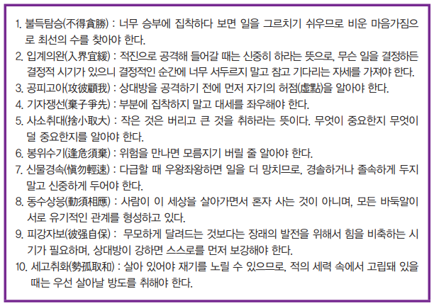 바둑은 내적 요소와 외적 요소로 구분할 수 있다. 내적 요소에서 가장 중요시되는 것은 바로 마음가짐이다. 왕적신(王積薪)[각주:3]은 그의 저서 위기십결(圍棋十訣)에서 바둑을 둘 때 명심하고 준수해야 할 마음가짐을 알려준다.