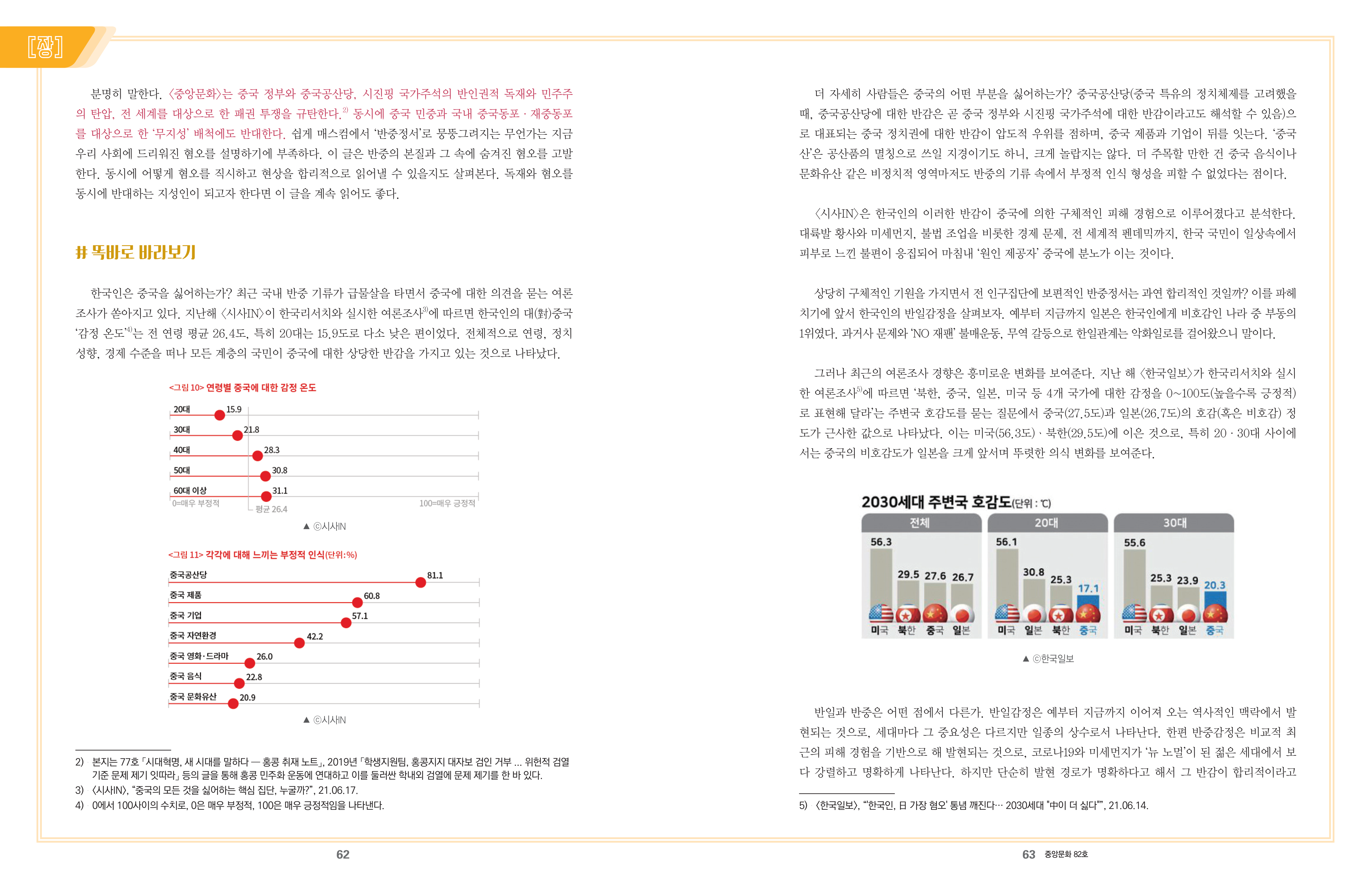 더 자세히 사람들은 중국의 어떤 부분을 싫어하는가? 중국공산당(중국 특유의 정치체제를 고려했을 때, 중국공산당에 대한 반감은 곧 중국 정부와 시진핑 국가주석에 대한 반감이라고도 해석할 수 있음)으로 대표되는 중국 정치권에 대한 반감이 압도적 우위를 점하며, 중국 제품과 기업이 뒤를 잇는다. ‘중국산’은 공산품의 멸칭으로 쓰일 지경이기도 하니, 크게 놀랍지는 않다. 더 주목할 만한 건 중국 음식이나 문화유산 같은 비정치적 영역마저도 반중의 기류 속에서 부정적 인식 형성을 피할 수 없었다는 점이다.