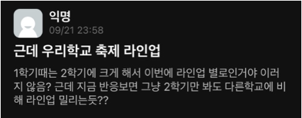라인업이 공개되자 학교 커뮤니티 '에브리타임'에서 가히 폭발적인 반응이 쏟아졌다. 그만큼 학생들의 기대가 컸다는 뜻일 테다. "싸이를 기대했는데 너무 실망스럽다", "우리 학교 라인업 이것밖에 안 되냐"며 한껏 아쉬움을 토로하는 의견들이 눈에 띄었다. 반면 "이 정도면 잘 섭외했다", "라인업이 마음에 들지 않으면 콘서트를 가라"는 등 만족스럽다는 반응도 있었다. 공통적으로 “특정 장르의 아티스트가 너무 많다”는 것이 불만이었다.