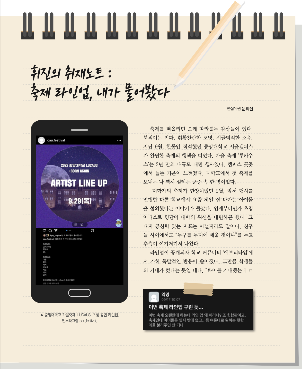 어디서부터 잘못된 것일까. 학생들이 꾸미고 학생들이 채워나간 축제에서 누구를 탓할 수 있단 말인가. 초청 공연이 축제의 전부는 아니다. 그러나 분명한 건 아티스트 라인업만 화려해도 “성공적”이라는 평가가 남는다는 것. 어느 대학교라고 거물급 가수와 인기 아이돌을 섭외하고 싶지 않겠나. 축제 시즌만 되면 ‘섭외 경쟁’은 과열되고, 화려한 라인업은 곧 재학생들의 자부심이다. 그러니까 이건, (다소 거창하지만) 중앙대의 위신과 중앙인의 자부심에 관한 문제다.
