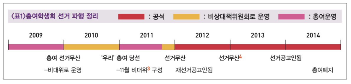 총여학생회는 1975년 탄생 이후 줄곧 존폐논란에 시달려 왔다. 아래 <표1>처럼 선거가 성사되지 않아 재선거를 진행하기도 했고 재선거마저 투표율 50%를 넘기지 못하거나 후보가 출마하지 않아 비상대책위원회 체제로 운영된 경우도 많다. 총여에 대한 관심부족과 선거파행은 기층 단위의 부재로부터 기인한다. 총학생회가 <표2>와 같이 학과 학생회와 단과대 학생회라는 기층단위가 존재한다면, 총여학생회는 구체적인 단위가 존재하지 않는다.