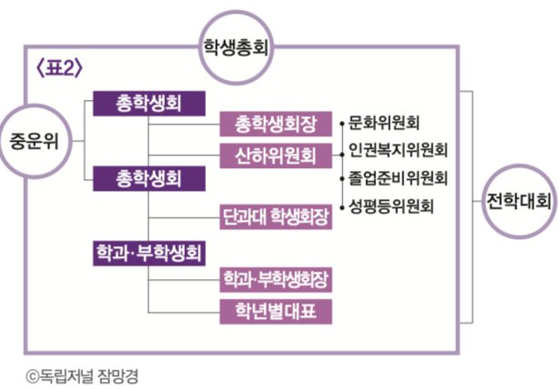 총여학생회는 1975년 탄생 이후 줄곧 존폐논란에 시달려 왔다. 아래 <표1>처럼 선거가 성사되지 않아 재선거를 진행하기도 했고 재선거마저 투표율 50%를 넘기지 못하거나 후보가 출마하지 않아 비상대책위원회 체제로 운영된 경우도 많다. 총여에 대한 관심부족과 선거파행은 기층 단위의 부재로부터 기인한다. 총학생회가 <표2>와 같이 학과 학생회와 단과대 학생회라는 기층단위가 존재한다면, 총여학생회는 구체적인 단위가 존재하지 않는다.