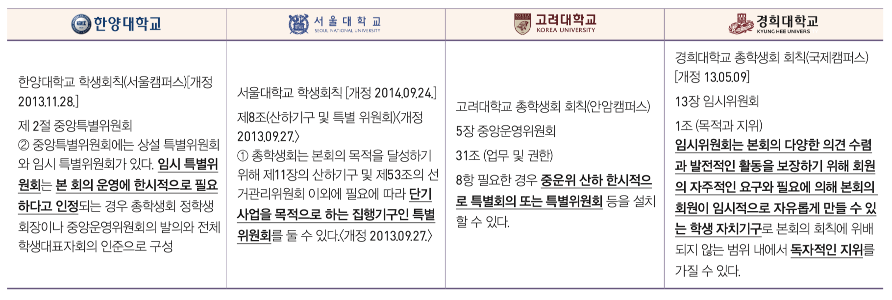 상설이 아니라 한시적으로 운영되는 산하기구들도 존재한다. 네 학교 모두 회칙 상으로 한시적 산하기구의 존재를 인정 하고 있다. 비정기적인 중요한 사안에 대해 효과적으로 대처하기 위한 노력의 일환이다. 중앙대의 임시기구인 교육개선위 원회와 비슷한 성격이라고 할 수 있겠다. 최근에는 네 학교 중 서울대와 고려대에서 활발히 운영되고 있다.