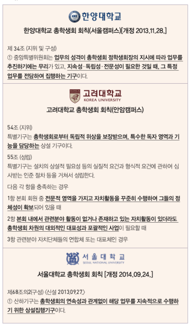 고려대 안암캠의 회칙은 성립 기준까지 자세히 명시하고 있다. 보다 명확한 고대 회칙은 일반 학우들의 특별기구 설립에 대한 접근성을 높여, 다양한 영역을 포괄하고 있는 고대의 특별기구체제를 형성하는데 기여했을 것으로 보인다. ‘자치’는 학생들과 직접 맞닿아있는 문제를 해결하고자 하는 의지에서 힘을 얻는다. 실제로 고대의 편입생위원회는 작년 2학기 전체학생대표자회의에서 “총학생회칙 특별기구 설립요건 1항 2항을 만족시켜서 특별기구를 만들려고 한다.”고 설립근거를 명확히 밝힌 바 있다.