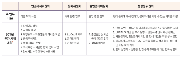 인권복지위원회, 문화위원회, 졸업준비위원회는 기존에 존재했던 산하기구다. 작년부터 성평등위원회가 출범하면서 4개의 산하기구 체제가 되었다. 각 위원회들의 사업을 보면 알 수 있듯이, 우리가 일상에서 자주 봐왔고, 매년 반복되는 상당수의 일선 실무들을 맡아하고 있다.