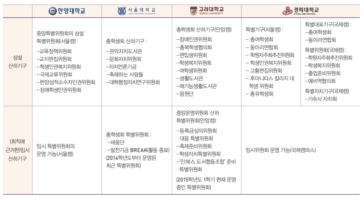상설이 아니라 한시적으로 운영되는 산하기구들도 존재한다. 네 학교 모두 회칙 상으로 한시적 산하기구의 존재를 인정 하고 있다. 비정기적인 중요한 사안에 대해 효과적으로 대처하기 위한 노력의 일환이다. 중앙대의 임시기구인 교육개선위 원회와 비슷한 성격이라고 할 수 있겠다. 최근에는 네 학교 중 서울대와 고려대에서 활발히 운영되고 있다.
