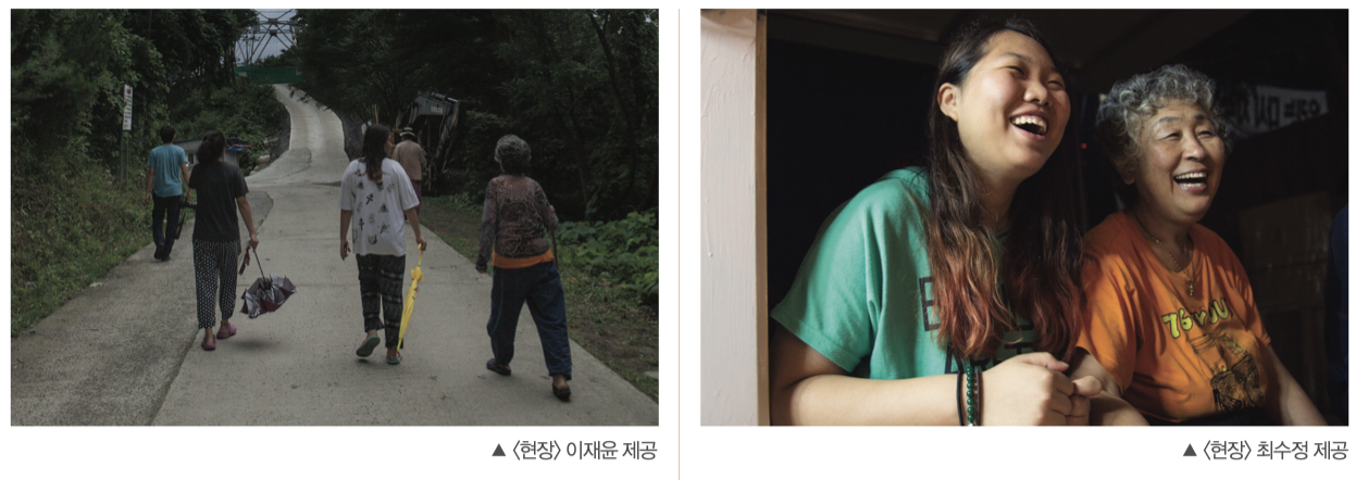 전가은 | 개인적으로 사진을 찍는 게 힘들지는 않았어요. 저는 작년에 밀양을 다녀왔는데, 오히려 밀양에 계신 할머니들과 어울리고 함께 지내는 시간이 정말 행복했어요. 다만 할머니들이 자기 몸 사리지 않고 반대 쪽 사람에게 “쳐봐라! 어디 한번 쳐봐라! 맞아보자!” 이렇게 적극적으로 저항하시는데, 그런 모습을 바라보는 게 너무 힘들었어요. 자기 몸을 상하게 하면서 절실히 저항하는 할머니들의 모습이 너무 안타깝고 슬펐던 기억이 나요.