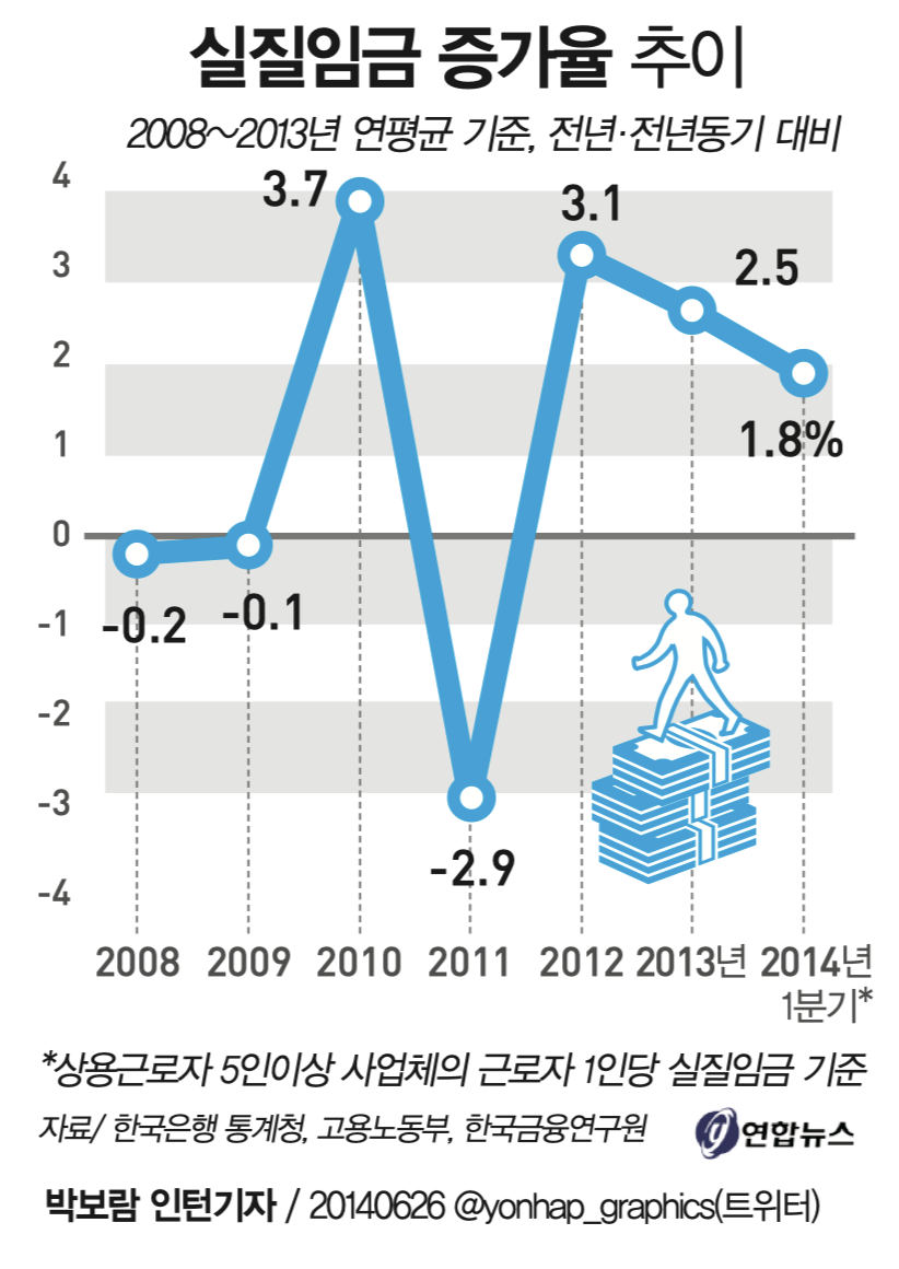 우리들의 삶이 어느 정도 나아졌는지를 파악하기 위해서는 경제성장률과 비교하여 실질임금의 증가율을 살펴볼 필요가 있다. 국민의 대부분은 소득을 국가가 생산한 전체 이윤에서 기업이 가져가는 몫을 제외한 임금의 형태로 얻기 때문이다. 2002년부터 2012년까지 10년 동안의 연평균 경제성장률은 3.8%를 기록했으나 실질임금 증가율은 2.1%에 그쳤다. 경제성장률만큼 노동자들이 받는 임금이 제대로 증가되지 않았다는 뜻이다. 특히, 전 세계적 경기침체의 원인이 되었던 2008년 미국발 금융위기 이후, 5년 동안의 연평균 성장률은 3.2%였으나 실질임금 증가율은 0.5%에 불과했다. [4] 2000년대 들어서 실질 임금 증가율이 경제성장률을 따라가지 못했는데, 글로벌 금융위기 이후에는 그 차이가 더욱 심각해진 것을 알 수 있다. 이를 통해 경제성장이 실질적으로 노동자들의 삶을 성장시키지 못했으며, 이익이 노동자들에게 제대로 분배되지 않았다고 해석할 수 있다. 특히나 2008년 이후, 노동자들의 몫은 더욱 감소했다는 것을 알 수 있다. 이는 한국의 경제성장이 노동자들과는 괴리된 형태로 발전하고 있음을 의미한다.
