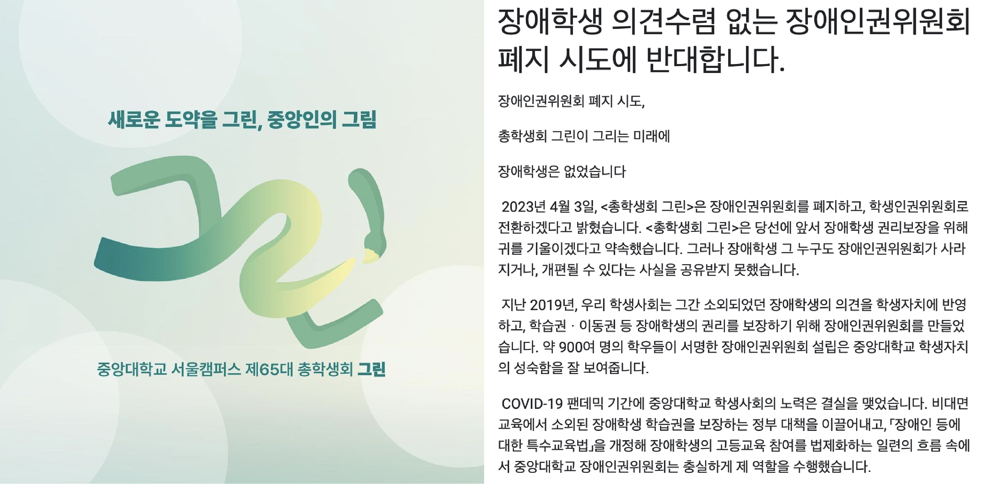 ‘그린’은 안건 상정 배경으로 ①공간 및 장학금 확보 문제 ②인복위 업무 과중 등을 지목했다. 그러나 일각에서는 900인의 연서명을 받아 설립된 자치 기구인 ‘장인위 폐지’ 안건을 중앙운영위원회에서 단독으로 상정한 것이 절차상 문제가 될 수 있다고 지적했다. 장인위 설립 당시 활동했던 A씨는 <중앙문화>와의 전화 인터뷰에서 “장애 당사자와 논의 없이 장인위 폐지가 담긴 업무조정안이 의결됐다”며 “위원회 관련 사안은 전학대회 이상의 자리에서 논의해야 하는 것”이라고 비판했다.