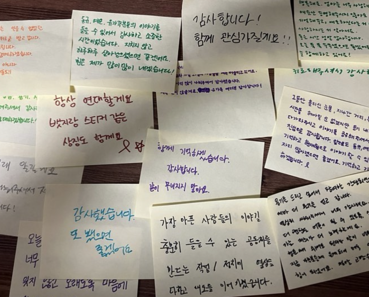 중앙대에서 인권 단체로 살아간다는 것은 어떤 의미일까. 가볍게는 훼손된 포스터에 덤덤해지는 것이다. 중페연의 페미 엠티 홍보 포스터는 학내 게시판에 부착한 지 5일 만에 도난당했다. 중페연 소속 단체 여백은 신입 모집 현수막을 무단 폐기당했으며13 녹지의 교지는 압정이 박힌 채 발견됐다14. 옥수수씨는 “(인권 단체들이) 실제로는 무엇을 하는지 알려고도 하지 않은 채 무작정 좋지 않은 말을 뱉는 사람들을 보면 화가 난다기보다 안타깝다”고 말했다. 그는 학교가 이러한 공격을 개인의 일탈로 여기며 진지하게 대응하지 않는 문제도 짚었다. “해결이나 회복에 대한 방안을 마련해야 하는 학교가 오히려 비협조적으로 나올 때도 있다”고 비판했다.