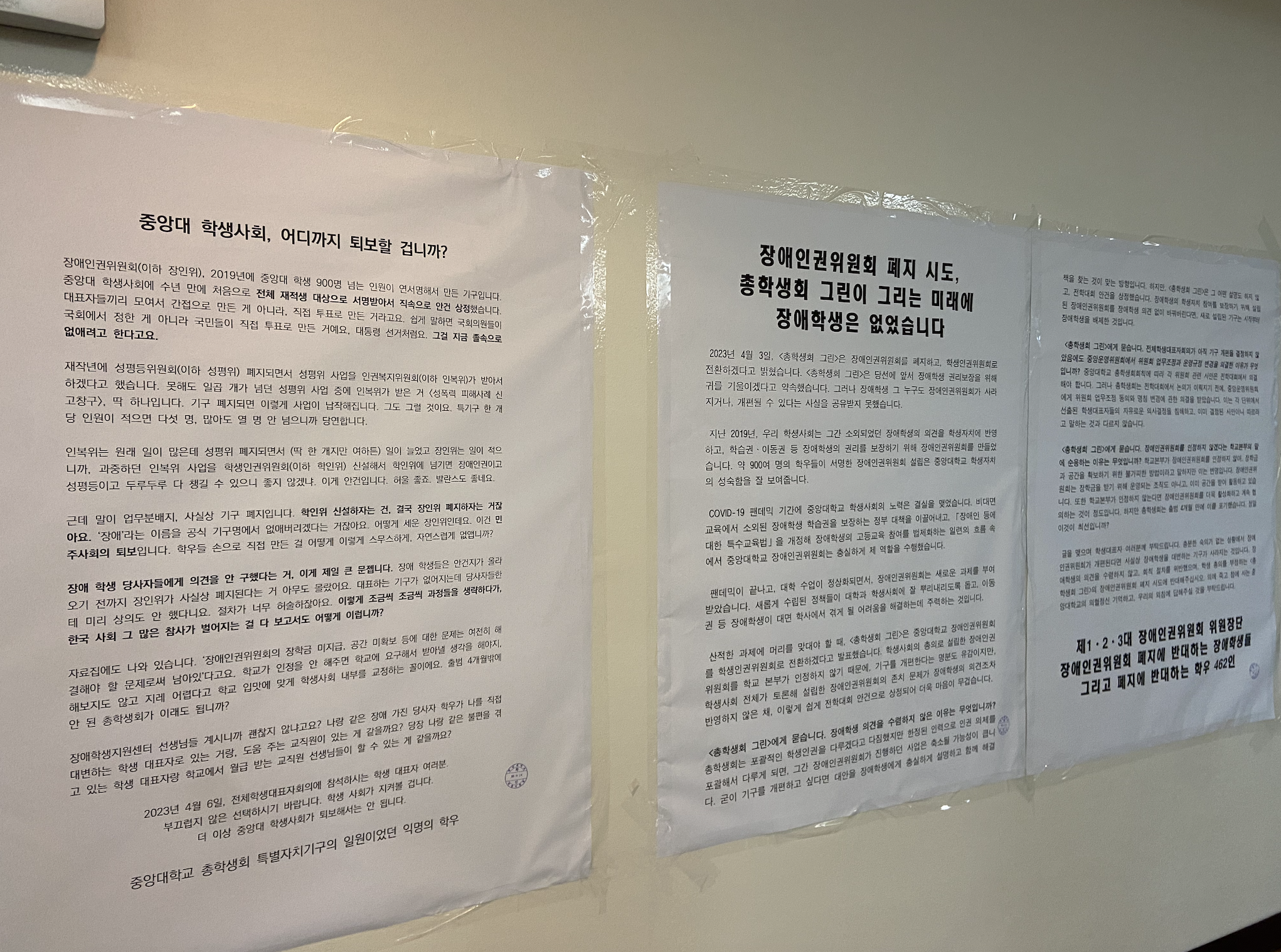 민주화 운동 이래 최전방에서 최후까지 투쟁하던 대학가는 가장 먼저 약자를 등지는 집단이 돼버렸다. 중앙대학교는 특히나 이 분야에서 지표식물1로 기능한다. 지난 4월 6일, 성평등위원회(이하 성평위) 폐지 546일만에 장애인권위원회(이하 장인위) 개편안2이 통과됐다3. 63.5%의 압도적 찬성률이었다. 표결에 따라 기존 장인위는 인권 의제를 포괄적으로 다루는 학생인권위원회(이하 학인위)로, 인권복지위원회(이하 인복위)가 학생복지위원회로 조정됐다. 그렇게 총여학생회(이하 총여)의 후신인 성평위 최초 폐지에 이어 장인위마저 역사의 뒤안길로 저물었다.