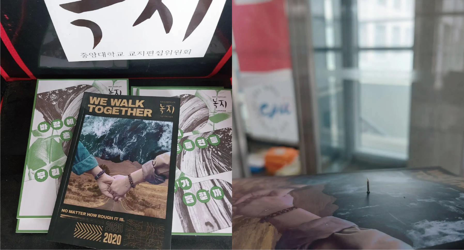 중앙대에서 인권 단체로 살아간다는 것은 어떤 의미일까. 가볍게는 훼손된 포스터에 덤덤해지는 것이다. 중페연의 페미 엠티 홍보 포스터는 학내 게시판에 부착한 지 5일 만에 도난당했다. 중페연 소속 단체 여백은 신입 모집 현수막을 무단 폐기당했으며13 녹지의 교지는 압정이 박힌 채 발견됐다14. 옥수수씨는 “(인권 단체들이) 실제로는 무엇을 하는지 알려고도 하지 않은 채 무작정 좋지 않은 말을 뱉는 사람들을 보면 화가 난다기보다 안타깝다”고 말했다. 그는 학교가 이러한 공격을 개인의 일탈로 여기며 진지하게 대응하지 않는 문제도 짚었다. “해결이나 회복에 대한 방안을 마련해야 하는 학교가 오히려 비협조적으로 나올 때도 있다”고 비판했다.