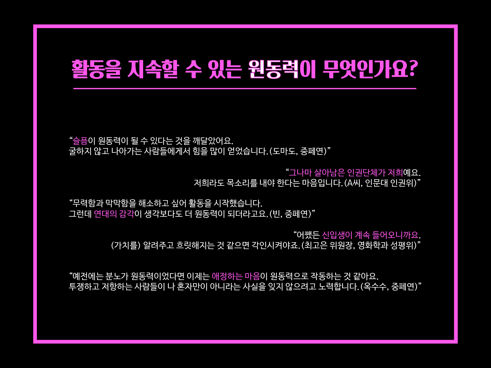 적어도 학인위가 학내 인권 단체들을 연결하는 교량의 역할을 수행해야 한다는 게 이들의 지론이다. 일례로 영화학과 성평위는 2019년 총학생회 성평위원장단 파면 사건16을 계기로 학과 학생회에 소속되기로 했다. “권력을 가진 한 사람이 이렇게나 쉽게 (기구를) 축출할 수 있다”는 점에 두려움을 느끼고 회칙에 기구를 성문화하기로 한 것이다. 그러나 회칙을 개정하는 일은 쉽지 않았다. 참고할 만한 자료들이 곳곳에 있어 찾아내는 것부터 일이었다. 최 위원장은 이러한 고충의 원인이 학내 인권 단체 간 연결망이 빈약하기 때문이라고 꼽았다. “2019년 중앙문화 좌담회17를 계기로 소통을 이어갔지만 현재는 대가 끊긴 상황”이라며 소통에 대한 인수인계가 없다 보니 매년 새로 시작해야 한다고 토로했다. 이에 대한 방안으로 옥수수씨는 학인위가 소수자를 대변할 자치 기구 설립 지원을 제안하기도 했다.