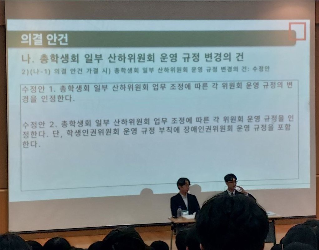 개편의 주요 원인인 업무 분담에 대해서도 말이 나왔다. 류 의장은 장인위로부터 인계받은 사업 중 70%를 진행한 상황이고, 1학기 내에 남은 30%도 이행 가능하다고 못 박았다. 박세욱 장애인권위원회 위원장(지식경영학부, 21학번) 또한 현 인복위 업무 중 절반을 이미 장인위와 협업하고 있기 때문에 감당 가능하다는 입장이었다.