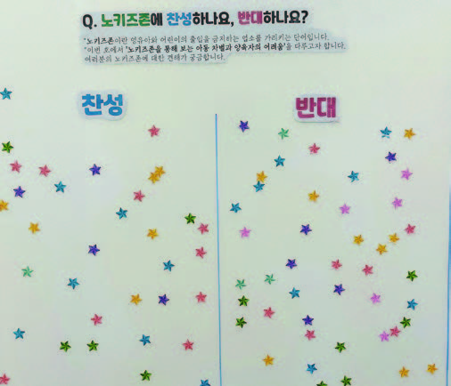 중앙대학교 학생들은 노키즈존을 어떻게 생각할까. 본지는 중앙대생을 대상으로 ‘노키즈존 찬반 여부’에 대해 이틀간(2023.05.22.~23) 간단한 스티커 설문을 진행했다. 그 결과 전체 응답자 100명 중 44명(44%)이 찬성을, 56명(56%)이 반대를 했다. 매우 근소한 차이로 반대 표가 조금 더 많았다. 두 설문에 비춰 봤을 때 지금 한국 사회는 노키즈존 찬성으로 여론이 기울었음을 알 수 있다. 하지만 노키즈존은 단언코 아동 인권 침해이며 차별이다. 또한 노키즈존의 확산과 수용은 현재의 한국 사회가 양육자를 달갑게 바라보지 않는다는 증거이기도 하다.